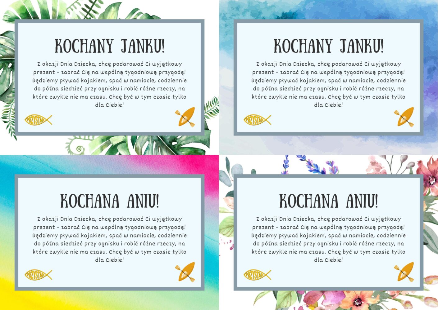 Na tą okazję stworzyliśmy cztery projekty kartek prezentowych, abyś mógł podarować swojemu dziecku wyjazd na spływ, rejs, wspinaczkę lub survival! Myślisz, że Twoje dziecko by się z tego ucieszyło?