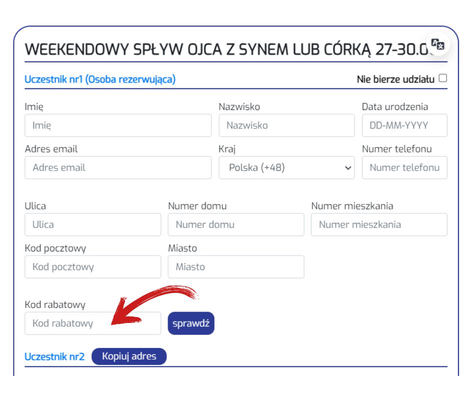 Aby z niej skorzystać należy podczas zapisywania się na wyprawę podać kod rabatowy: KDR2026. Pole do wpisywania kodu znajduje się w formularzu zapisowym pod danymi osoby zamawiającej (patrz poniższy screen).